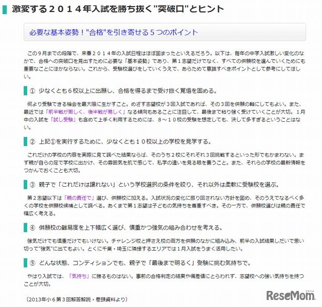 首都圏模試センターは9月13日、「激変する2014年入試を勝ち抜く"突破口"とヒント」と題して合格のための5つのポイントをホームページに掲載した。受験校選びをしていく上で、あらためて意識すべきポイントを紹介している。