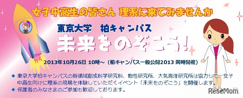 東京大学柏キャンパスは、女子中高生向けに理系の現場を体験できるイベント「未来をのぞこう」を10月26日に開催する。新領域創成科学研究科、物性研究所、大気海洋研究所の3つの研究機関がそれぞれガイドツアーなどを行うという。
