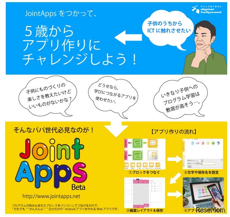 デジタルハリウッドは、「5歳からのアプリ作り 親子ワークショップ」を東京・大阪・鳥取の3都市で開催する。プログラムが組み込まれたブロックをパソコン上でつなげるだけで簡単アプリを制作することができるため、子どものころからICTに触れさせることができるという。