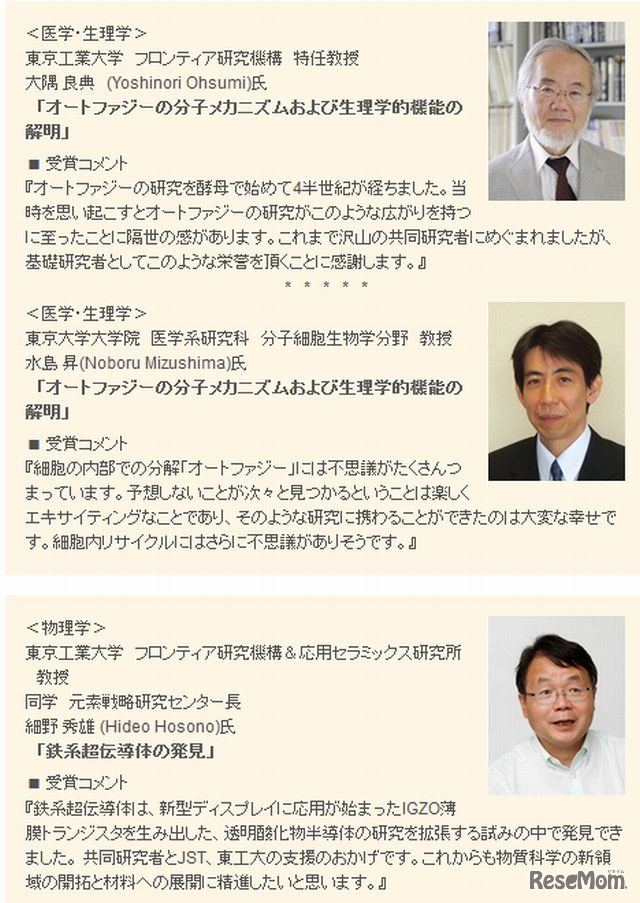 トムソン・ロイターは、10月7日より予定されているノーベル賞に先駆け、「トムソン・ロイター引用栄誉賞」を発表した。日本からは、東京工業大学の細野秀雄氏、大隅良典氏、東京大学の水島昇氏の3名が受賞した。