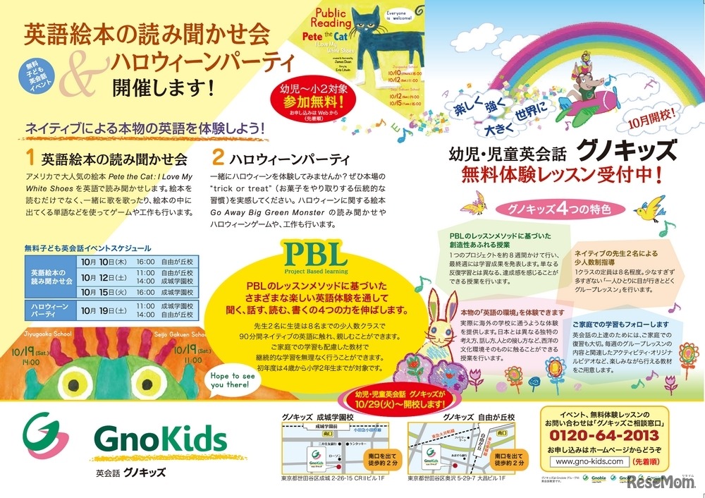 大学受験塾や中学受験塾を運営するグノーブルグループは、年少児(4歳)から小学2年生を対象とした英会話教室「グノキッズ」を開設、10月29日に自由が丘校と成城学園校を同時開校する。