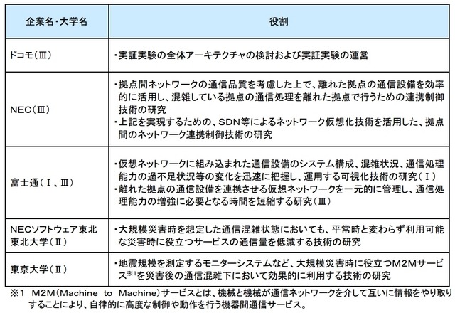 NTTドコモ、日本電気(NEC)、富士通、NECソフトウェア東北、東北大学、東京大学は2日、大規模災害時における通信混雑の緩和技術について、実証実験を開始した。東北大学構内(仙台市)と横須賀リサーチパーク内(神奈川県横須賀市)にあるテスト環境を仮想化し連携する。