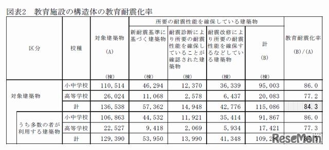 会計検査院は10月9日、全国44都道府県にある公共建築物の耐震化対策について調べた調査結果を公表した。公立の小中高校が84.3%だったほか、医療施設76.1%、庁舎施設68.8%、警察施設91.3%、消防施設60.0%と、ほとんどの建物で耐震化率が目標の9割を下回った。