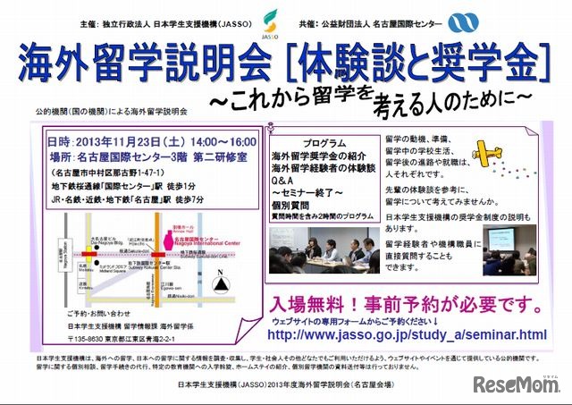 日本学生支援機構(JASSO)は、海外留学希望者を対象とした海外留学説明会を、11月16日(土)に札幌、11月23日(土)に名古屋、2014年1、2月に東京で行う。留学に関心はあるがまだ具体的に考えたことがない人、体験談を聞いてみたい人など、誰でも参加できる。