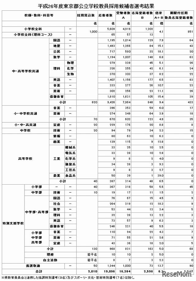 東京都教育委員会は10月18日、平成26(2014)年度東京都公立学校教員採用候補者選考の集計結果を発表した。受験倍率は全体で6.3倍と過去5年間で最高の受験倍率となった。