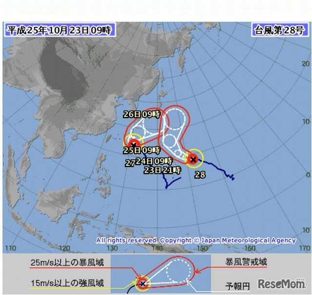 気象庁が10月23日9時50分に発表した台風情報によると、非常に強い台風27号(フランシスコ)は、強い勢力を維持しながら沖縄に接近し、その後、進行方向を次第に北東に変える見込みという。