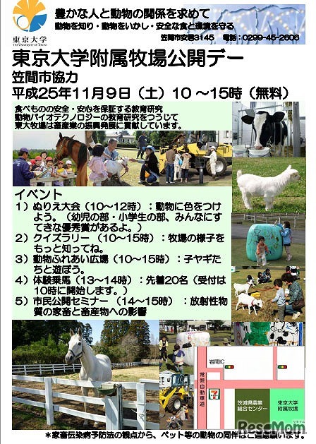 東京大学大学院農学生命科学研究科附属牧場は11月9日、農学生命科学研究科・農学部附属牧場の一般公開を開催する。ふれあい広場などのイベントや食の安全に関する市民公開セミナーを予定している。