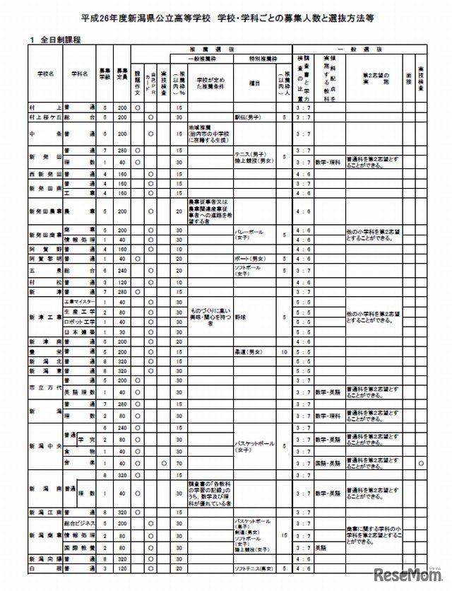 新潟県教育委員会は10月29日、平成26(2014)年度の公立高校の入学者選抜要項について公表した。募集人員は全日制77校で1万6,180人となり、昨年度より160人減員した。一般選抜の学力検査は3月11日、合格発表は3月13日。