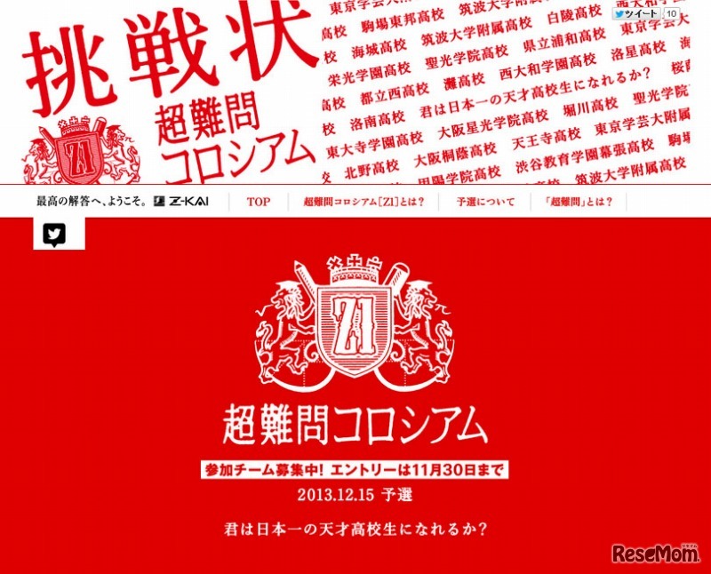Z会は、日本一の天才高校生を決めるコンテスト「超難問コロシアム[Z1]」を開催、10月31日(天才の日)に参加チームの募集を開始した。英語・数学・国語・理科・地歴公民の範囲から、Z会が考える極めて難易度の高い「良問」の解答を競う。