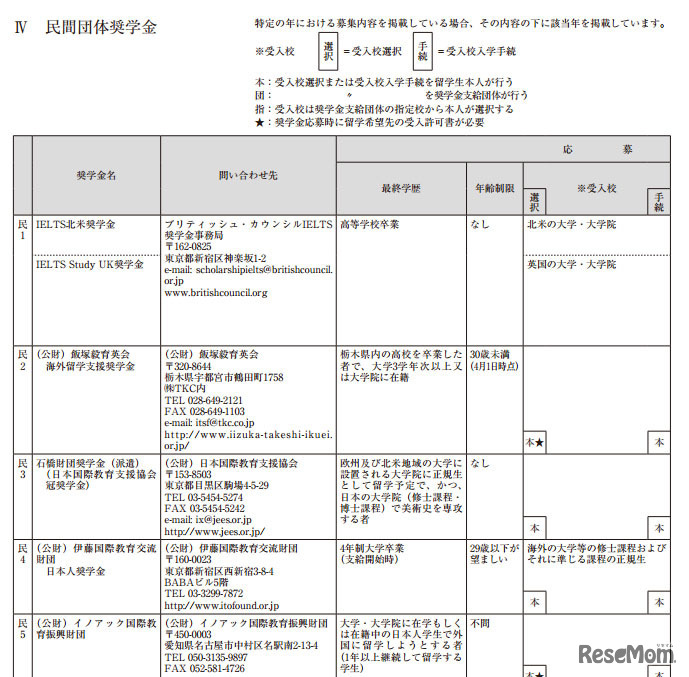 日本学生支援機構(JASSO)は、海外留学奨学金情報を一冊にまとめた「海外留学奨学金パンフレット」を作成、同機構ホームページに公開した。JASSOの奨学金だけでなく、地方自治体の奨学金、外国政府などの奨学金、民間団体の奨学金を幅広く紹介している。