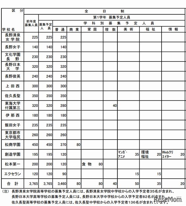 長野県教育委員会は10月31日、平成26(2014)年度の長野県公立高校と私立高校の募集定員を発表した。公立高校(全日制)は16,240人、私立高校(全日制)は3,765人で、どちらも前年度と同数。
