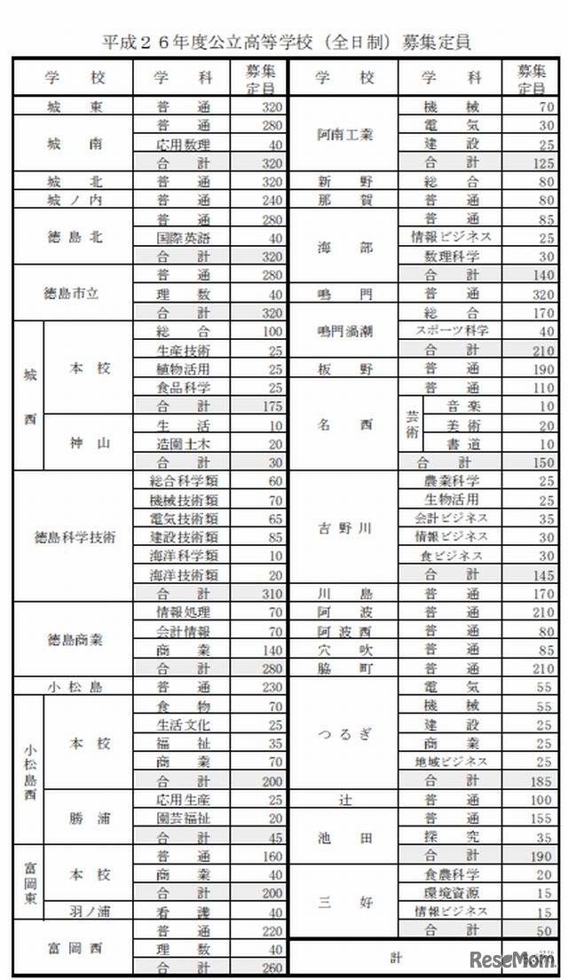 徳島県教育委員会は10月28日、平成26(2014)年度公立高校の学校別・学科別募集定員を発表した。全日制は前年度比105人増の6,330人、定時制は前年度と同数の370人募集する。