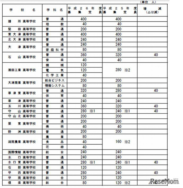 滋賀県教育委員会は11月1日、平成26(2014)年度県立高校の募集定員を発表した。前年度と比べて中学校卒業予定者数が230人増加することから募集人員を160人増やし、全日制46校で計10,680人募集する。