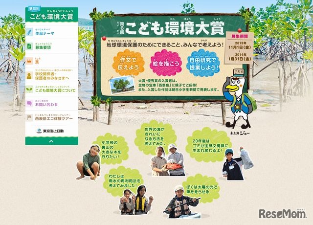 朝日新聞社と東京海上日動は、「第6回こども環境大賞」を開催するにあたり、地球環境保護をテーマにした作文・絵画・自由研究の作品を募集する。対象は全国の小学生。募集期間は2014年1月31日まで。