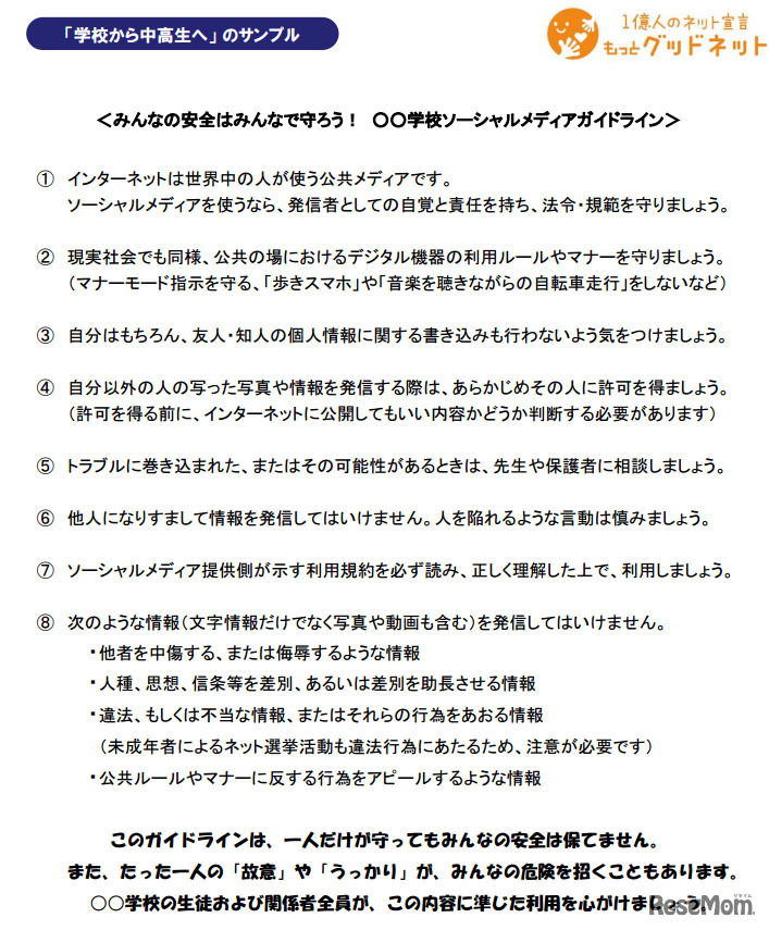 「ソーシャルメディアガイドライン」 作成例(学校から中高生へ)