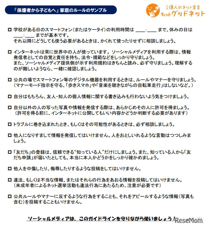 安心ネットづくり促進協議会(JISPA)は、「『ソーシャルメディアガイドライン』づくりのすすめ」をホームページで公開、学校やPTA団体、教育関連機関向けに、インターネットに関する子どもとのルールづくりの例を紹介している。