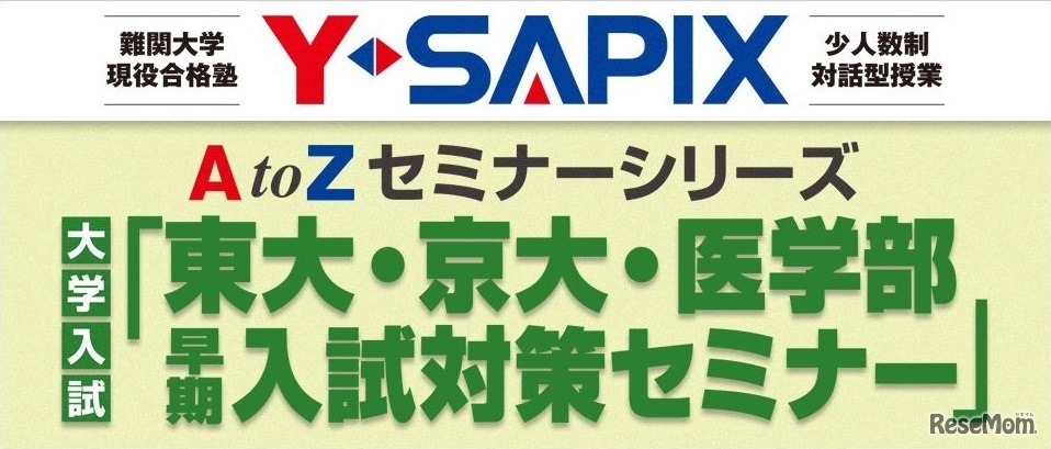 難関大学現役合格塾のY-SAPIXは難関大学を目指す高校2年生までの生徒および保護者を対象に「東大・京大・医学部早期入試対策セミナー」を実施する。名古屋を皮切りに6か所で行われ、入場は無料だ。