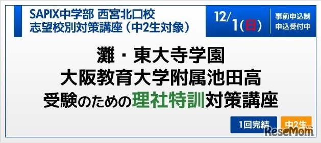高校受験で高い合格率を誇るSAPIX(サピックス)中学部が灘・東大寺学園・大阪教育大学附属池田高を目指す中学2年生を対象に、「理社特訓対策講座」を12月1日に同西宮北口校で実施する。理科・社会ともに表現力や多角的な思考力を指導する。