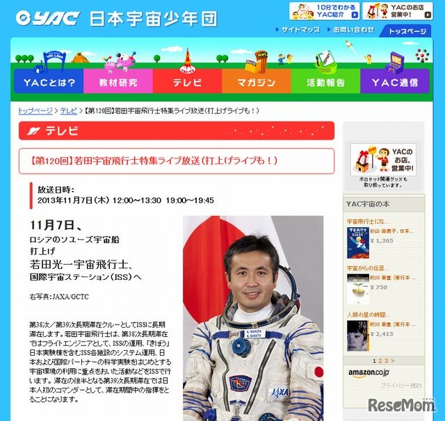 若田宇宙飛行士が搭乗するソユーズ宇宙船が、11月7日(木)13時14分(日本時間)に打上げられる。JAXAや日本宇宙少年団のホームページでは、若田宇宙飛行士への応援メッセージをツイッターや掲示板で募集している。
