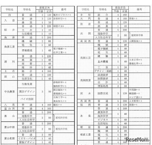 富山県教育委員会は10月4日、平成26(2014)年度県立高校の募集定員を発表した。全日制の募集定員は合計7,144人で前年度比10人減となった。