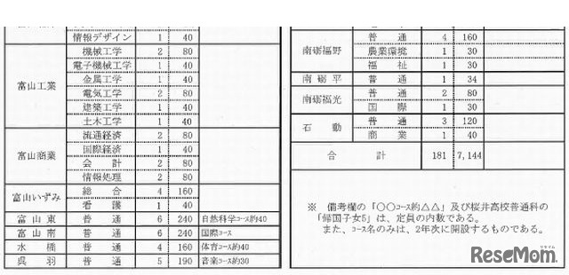 富山県教育委員会は10月4日、平成26(2014)年度県立高校の募集定員を発表した。全日制の募集定員は合計7,144人で前年度比10人減となった。