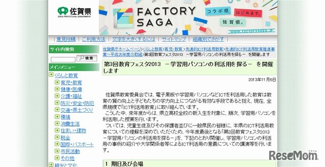 佐賀県教育委員会は11月9日と10日、今年度最後となる「第3回教育フェスタ2013」を開催する。当日は、学習用パソコンの活用事例の紹介や、ICT利活用の意義についての講演が行われる。事前申込みは不要。