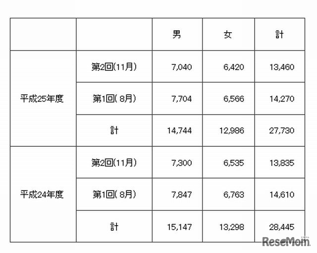 文部科学省は11月5日、平成25年度第2回高等学校卒業程度認定試験の出願状況を公表した。出願者数は13,460人で、前年度(平成24年度第2回)と比べて375人(2.8%)の減少となった。試験は、11月9日、10日の2日間実施される。