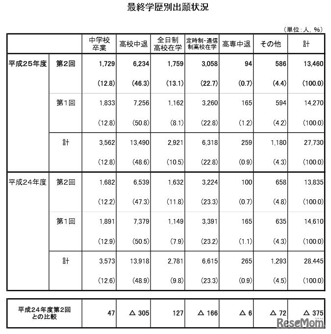 文部科学省は11月5日、平成25年度第2回高等学校卒業程度認定試験の出願状況を公表した。出願者数は13,460人で、前年度(平成24年度第2回)と比べて375人(2.8%)の減少となった。試験は、11月9日、10日の2日間実施される。