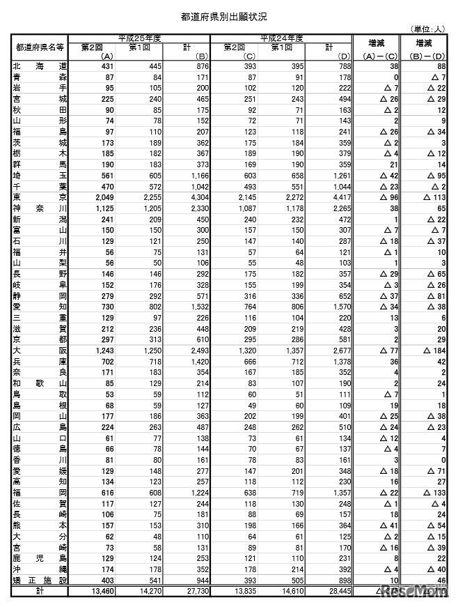 文部科学省は11月5日、平成25年度第2回高等学校卒業程度認定試験の出願状況を公表した。出願者数は13,460人で、前年度(平成24年度第2回)と比べて375人(2.8%)の減少となった。試験は、11月9日、10日の2日間実施される。