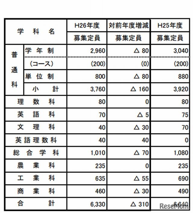山梨県教育委員会は11月6日、平成26(2014)年度公立高校の募集定員を発表した。前年度と比べて県内中学校卒業予定者が424人減少することなどから、募集定員を310人減らし、全日制で計6,330人募集する。