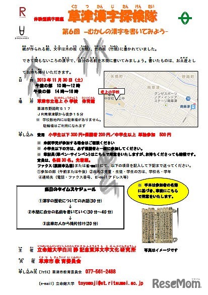 立命館大学白川静記念東洋文字文化研究所は、漢字をテーマにした体験型イベント「草津漢字探検隊」を11月30日、市立老上小学校で開催する。対象は小中学生。