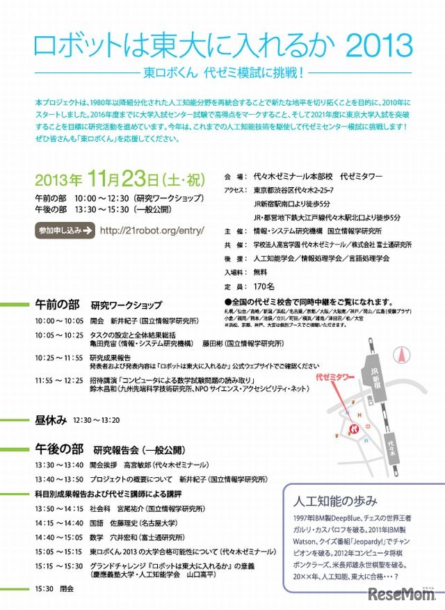 2021年度に東京大学入試を突破することを目標としている「東ロボくん」が11月23日、代々木ゼミナールの模試に挑戦する。同日、代々木ゼミナール本部校では結果発表会が開催される。参加費は無料。