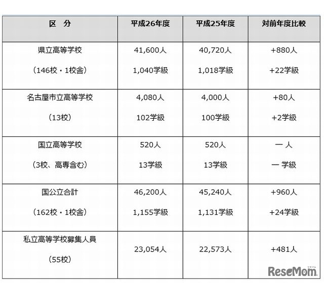 愛知県教育委員会は11月8日、平成26(2014)年度県立高校の募集定員等を発表した。県内中学校の卒業予定者が増加することなどから、県立高校については前年度より880人多い41,600人を募集する。