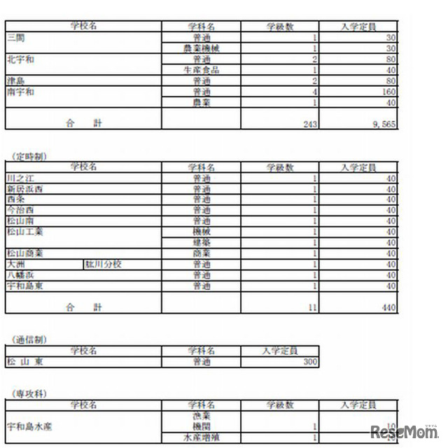 愛媛県教育委員会は10月15日、平成26(2014)年度県立高校の募集定員および選抜要項を発表した。募集人員を200人減らし、全日制599学級で計9,565人募集する。少子化の影響から、15年連続の定員減少となる。