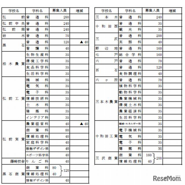 青森県教育委員会は10月23日、平成26(2014)年度県立高校・中学校の募集定員等を発表した。県内の中学校卒業予定者が、前年度比65人減の13,249人ほどになることから、全日制県立高校は前年度比95人減の9,385人を募集する。