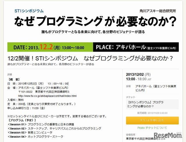 角川アスキー総合研究所は12月2日(月)、シンポジウム「なぜプログラミングが必要なのか?」をアキバホールにて開催する。まつもとゆきひろ氏や古川享氏などが登壇予定。参加費は無料で、事前申込みが必要。