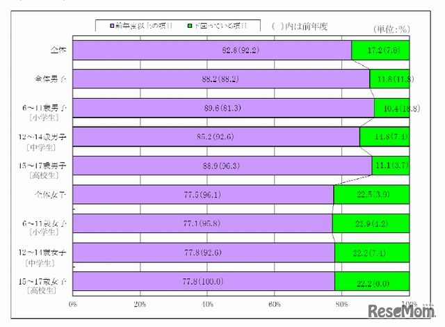 広島県教育委員会は平成25年度(2013年度)県内の児童生徒の体力・運動能力調査結果の速報版を公表した。全体では県平均値が「前年度以上の項目」は約8割で前年度と比較して1割減ったが、全国調査と比較すると前年度より8.8ポイント増加した。