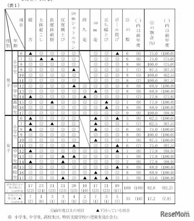 広島県教育委員会は平成25年度(2013年度)県内の児童生徒の体力・運動能力調査結果の速報版を公表した。全体では県平均値が「前年度以上の項目」は約8割で前年度と比較して1割減ったが、全国調査と比較すると前年度より8.8ポイント増加した。