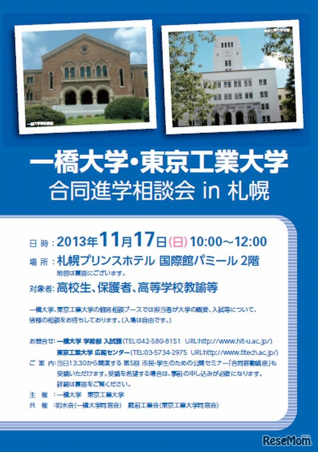 一橋大学と東京工業大学は11月17日(日)、札幌市で合同進学説明会を開催する。事前予約は不要で、入場は自由。道内の高校生、受験生とその保護者、高校教諭が対象となる。