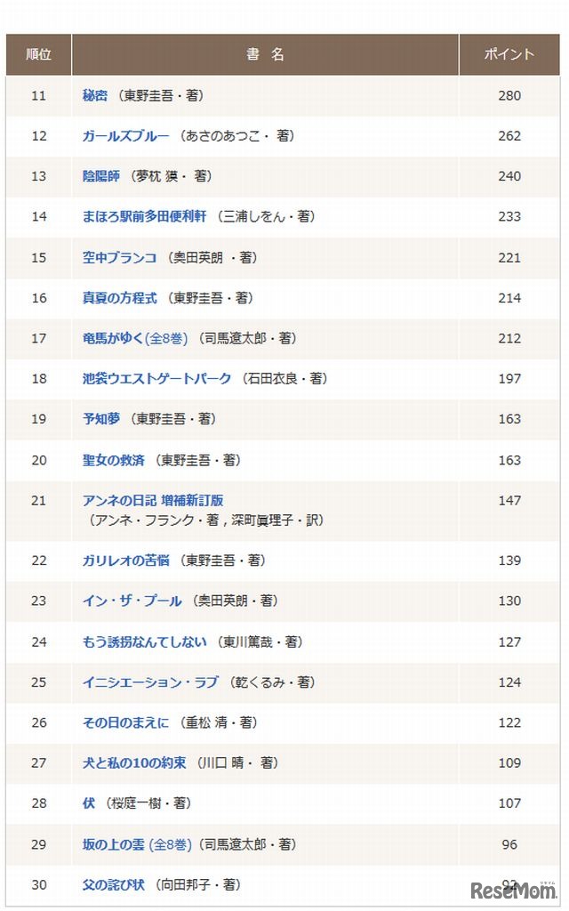 文藝春秋は11月12日、高校生が選んだ「文春文庫」人気作品ベスト30を発表した。30位までの結果と上位10作品の感想の一部は、13日より文藝春秋のサイト「本の話WEB」に掲載されている。