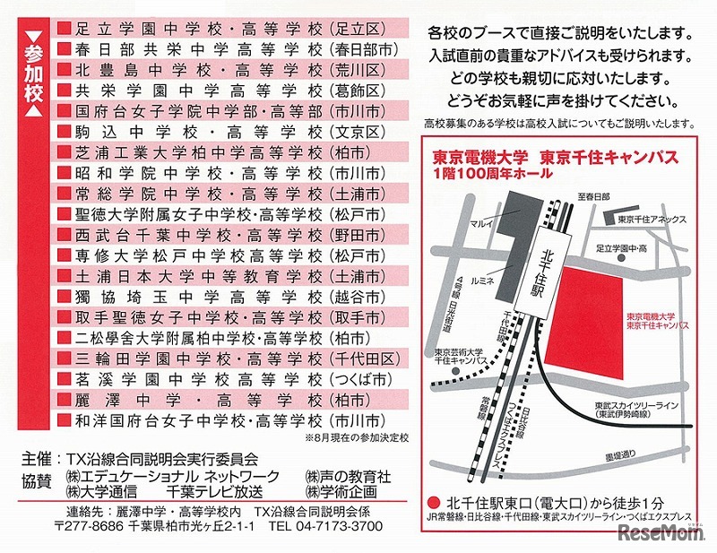 「TX(つくばエクスプレス)沿線私立中学校合同説明会」が11月24日、東京電機大学・東京千住キャンパスで開催される。東京、埼玉、千葉、茨城1都3県からの20校が集まり、ブースでの個別相談や、入試直前のアドバイスなどを受けることができる。