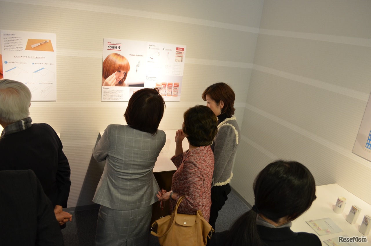 学制が開発した化粧綿棒を見る西川京子副大臣、川合眞紀教授、武田美保氏
