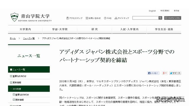 青山学院大学は11月14日、アディダスジャパンとスポーツ分野でのパートナーシップ契約を締結したと発表した。同大学は、2012年から陸上競技部とアディダスジャパンの間でオフィシャルパートナーシップ契約を結んできたが、今回は大学全体でのパートナーシップ契約となる。