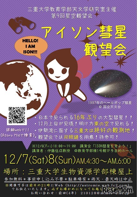 三重大学は、学生・教職員・一般を対象とした「アイソン彗星講演会と観望会」を、講演会は12月6日、観望会は7日、8日の両日に開催する。入場は無料。