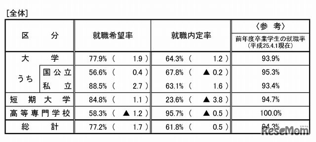 厚生労働省と文部科学省は11月15日、平成25年度大学等卒業予定者の就職内定状況調査の結果を公表した。来春卒業予定の大学生の内定率は10月1日現在64.3%で、3年連続の上昇となった。