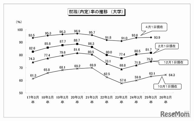厚生労働省と文部科学省は11月15日、平成25年度大学等卒業予定者の就職内定状況調査の結果を公表した。来春卒業予定の大学生の内定率は10月1日現在64.3%で、3年連続の上昇となった。