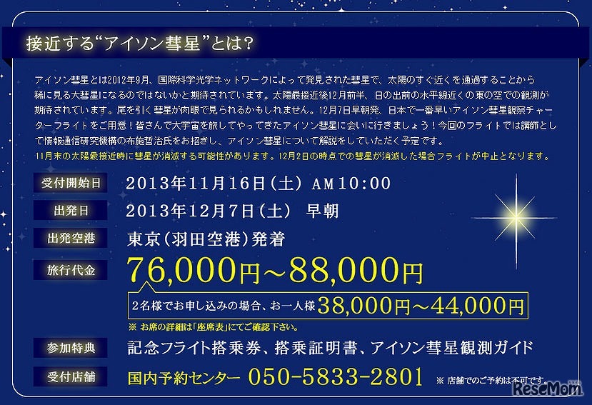 エイチ・アイ・エス国内事業部は、12月7日早朝発のスカイマークチャーター便による「アイソン彗星観察チャーターフライト」を販売している。約90分間のフライトには、天体ガイドとして布施哲治氏が同乗し、彗星の特別解説が行われる予定だ。