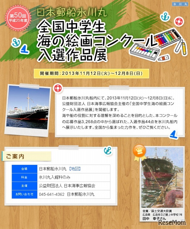 日本郵船氷川丸は、11月23日と24日の両日、船上オープンデッキを特別開放する。「全国中学生 海の絵画コンクール 入選作品展」を12月8日まで開催。応募作品3,268点の中から選ばれた入選作品44点を船内で展示する。