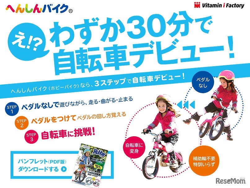 ビタミンiファクトリーは、ペダルのないバランスバイクを使用した「30分で乗れる自転車教室」を全国で開催。これまで1,500人の子どもたちが参加しているという。