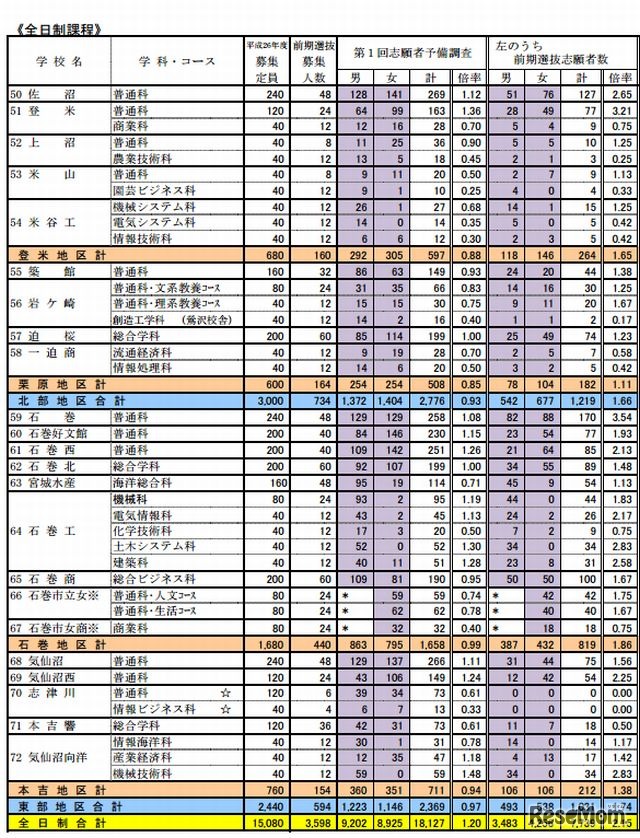 宮城県教育庁高校教育課教育指導班は11月11日、平成26(2014)年度公立高校の入学者選抜について、第1回志願者予備調査の結果を発表した。これによると、募集定員は前年度比80人減の15,080人、志願倍率は前年度比0.01ポイント増の1.20倍となった。